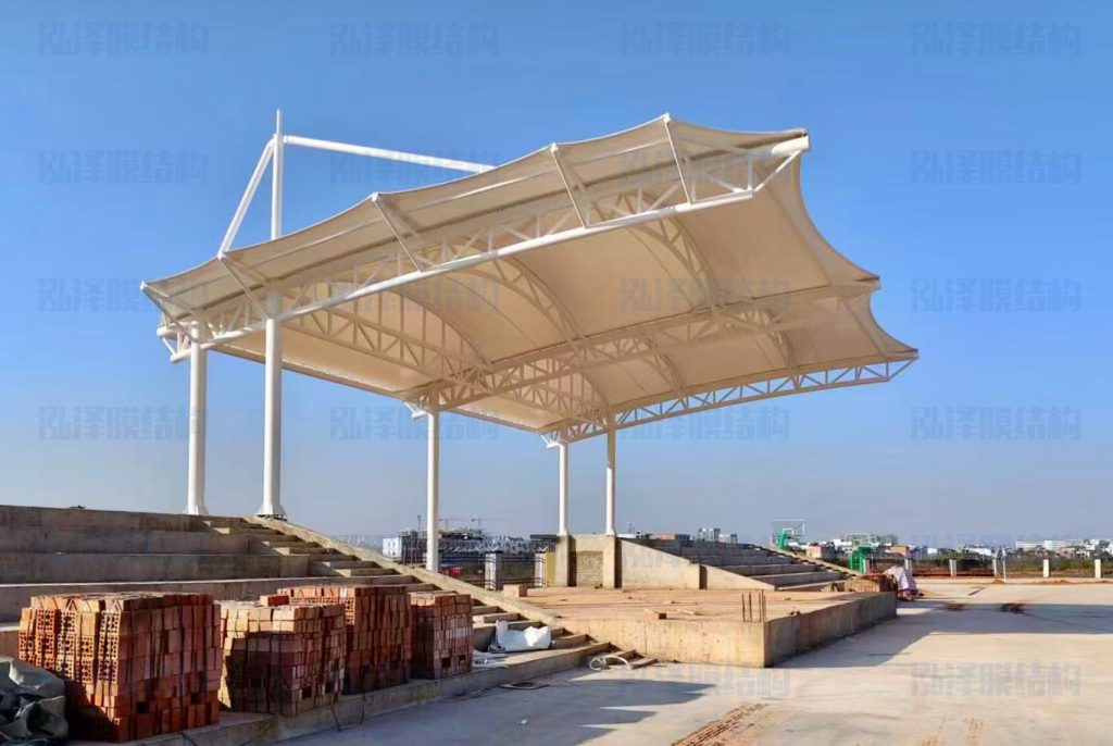 学校膜结构主席台,顾名思义,就是应用于学校主席台区域的膜结构建筑形式。 膜结构是一种由高强度柔性薄膜材料与钢结构相结合的建筑形式,通过特殊的张拉技术形成稳定的空间结构。与传统建筑相比,它拥有轻巧、通透、美观等诸多优势。 学校膜结构主席台适用的场景 膜结构主席台不仅适用于校园操场、主席台,还可以在其他校园场景中大显身手。 操场看台:用于体育比赛或大型活动,膜结构主席台的遮阳功能能为观众提供舒适的观赛体验。 细节决定成败,赣州科技城职业学校膜结构主席台工程中,每个细节都严格计算和精心设计,使得整个主席台不仅具有优美的线条、出色的遮阳性能。